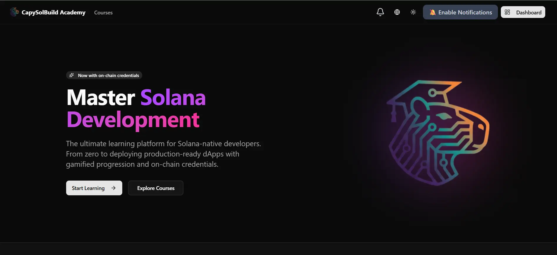 Gamified Solana learning platform with hands-on challenges, learning paths, and on-chain credentials for developers.