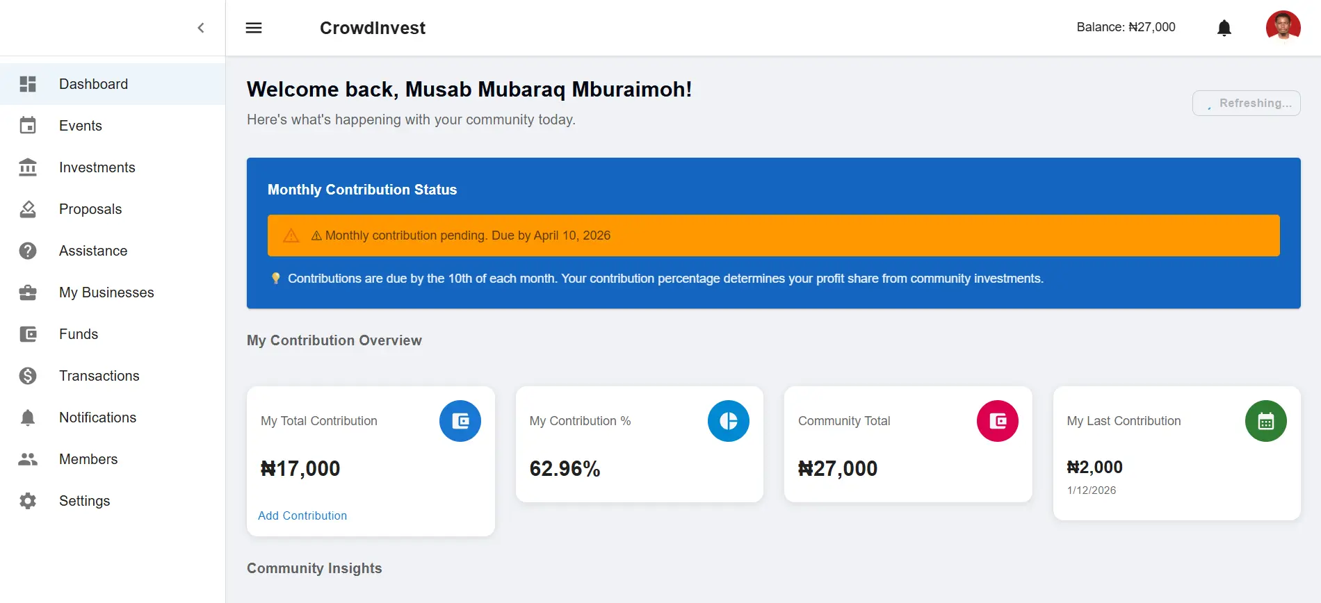 Community-driven investment platform for events and projects with contribution tracking and transparent profit visibility.